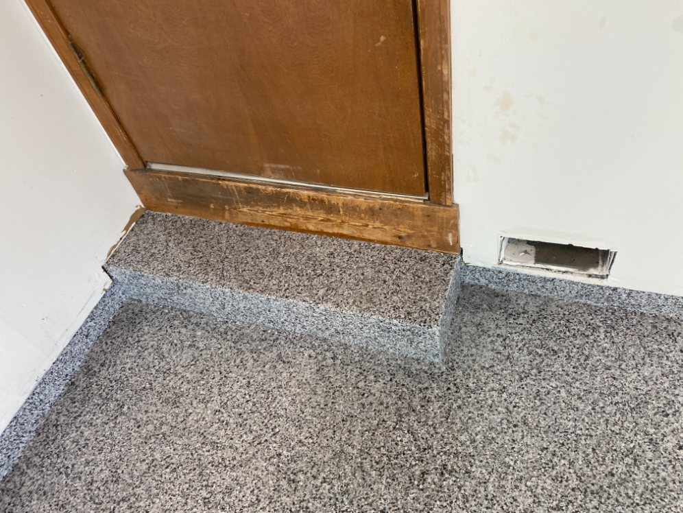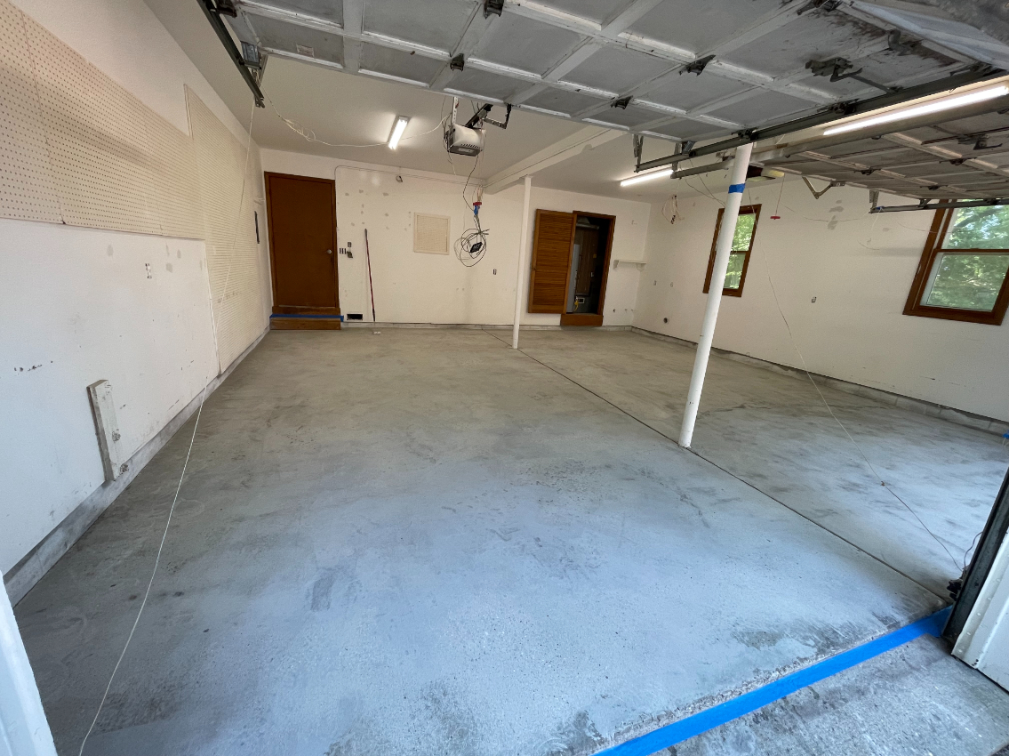This floor need self leveling to fix all the pitting & spaulding. 1 wood step leading into house, fixed all cracks, pitting, spaulding, remove all oil stains, paint overspray, ect. Then complete floor grind, install FloorShield 100% Polyaspartic Concrete Coating System. Also fix old wood step & vertical sidewalls to match entire floor. Includes 15 Year Non-Pro-rated Manufacture Warranty.