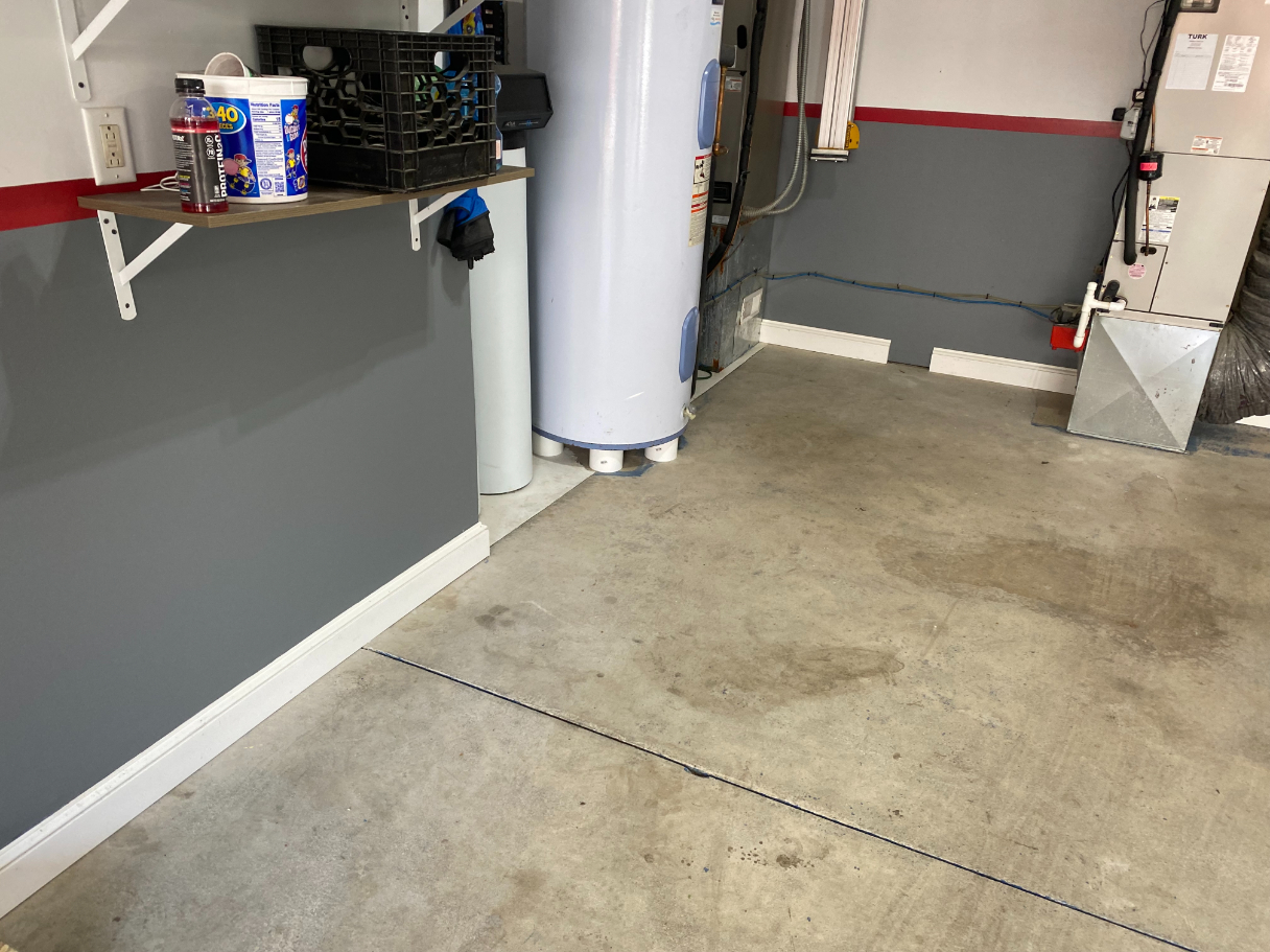 Large 3 car garage. Filled in control joints for customer, fix & repair pitting & spaulding, Diamond grind garage floor including partially painted garage floor, Coated steps, around water softener, HVAC system, also applied base coat (only)on driveway approach apron. making this project really stand out with that Old School Mustang. 15 Year Manufacture Warranty.